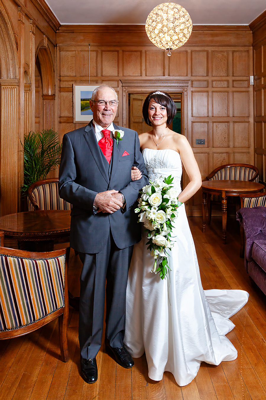 Coombe Lodge is an old, large country manor house with extensive beautiful gardens and grounds. It was one of the top wedding venues in the area. Unlike the previous day, at Steve and Dereks ceremony, it was raining when we arrived at the venue and continued to rain throughout the whole day. I’d equipped myself with a number of white umbrellas, which we used for a few outside shots, but they wouldn’t be of any use for the larger group shots. Fortunately there were plenty of large rooms within the venue we could use and I’d taken my studio lights and soft boxes along just in case we would need them. About 90% of the images from that day were shot indoors.