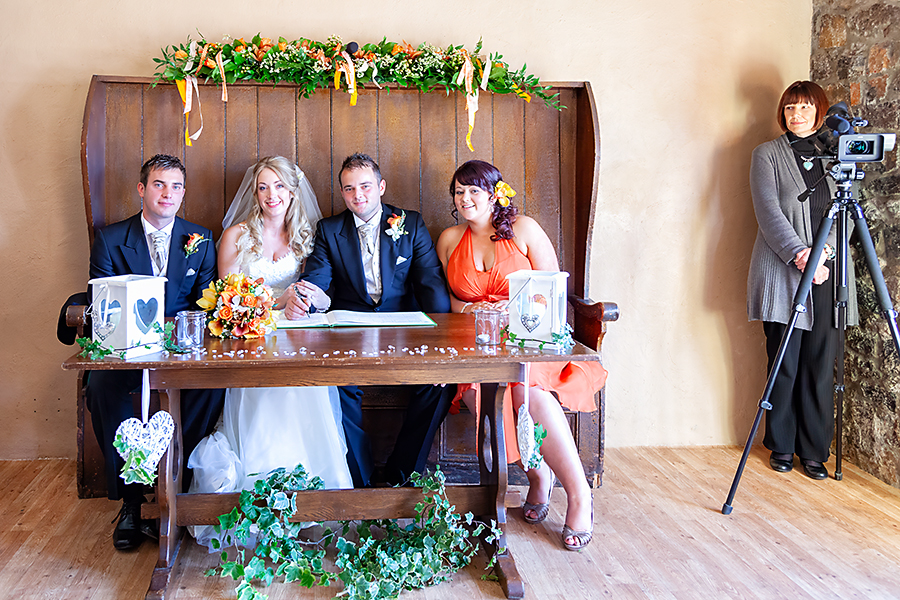 October and the wedding of Tom and Sam, my first professional booking although by this time we’d shot ten weddings. Sam had booked a small wedding venue in North Somerset which was part of a carp fishing lake complex. The venue had two barns, at right angles to each other. The main ceremony room was quite well lit with natural light but it was quite narrow with the desks, the registrars were going to use to run the ceremony, very close to the rear and sidewall.