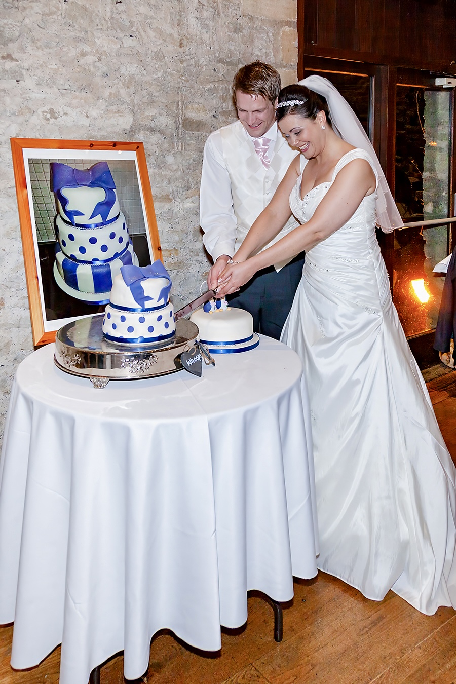 The actual wedding day went pretty much to plan although there was drama on the day before the wedding. Nicola’s three tiered wedding cake had been delivered to the venue but, after being set up, the second cake tier collapsed into the bottom tier. Nicola’s initial reaction to that was despair, but she turned it around into a fun talking point on the wedding day. The cake was still edible so she displayed it with a picture of what it should have looked like as per the image below.