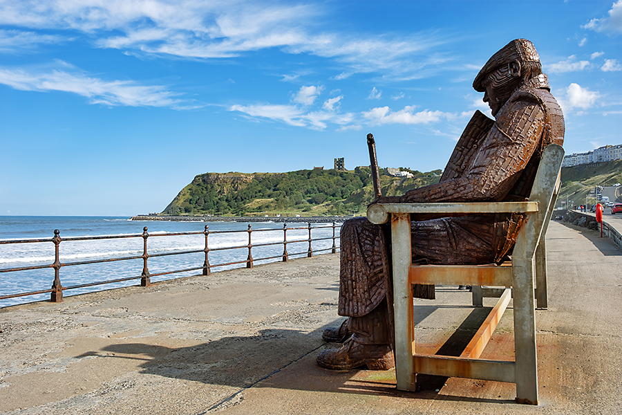 North Bay, Scarborough looking back towards Scarborough Castle on top of the hill. The giant sculpture in the foreground is called Freddie Gilroy.