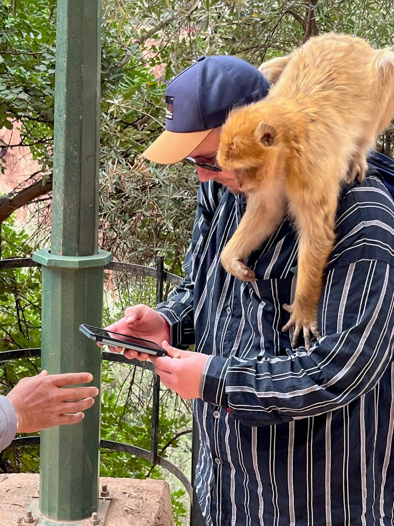 The Moroccan guy with the monkeys had a carrier bag full of peanuts. He was trying to force these into peoples hands or dropping them into peoples shirt pockets, encouraging the monkeys to climb up onto them. Several of our group were quite happy to have the monkeys climbing over them, trying to balance them on their shoulders and heads whilst trying to grab a selfie.