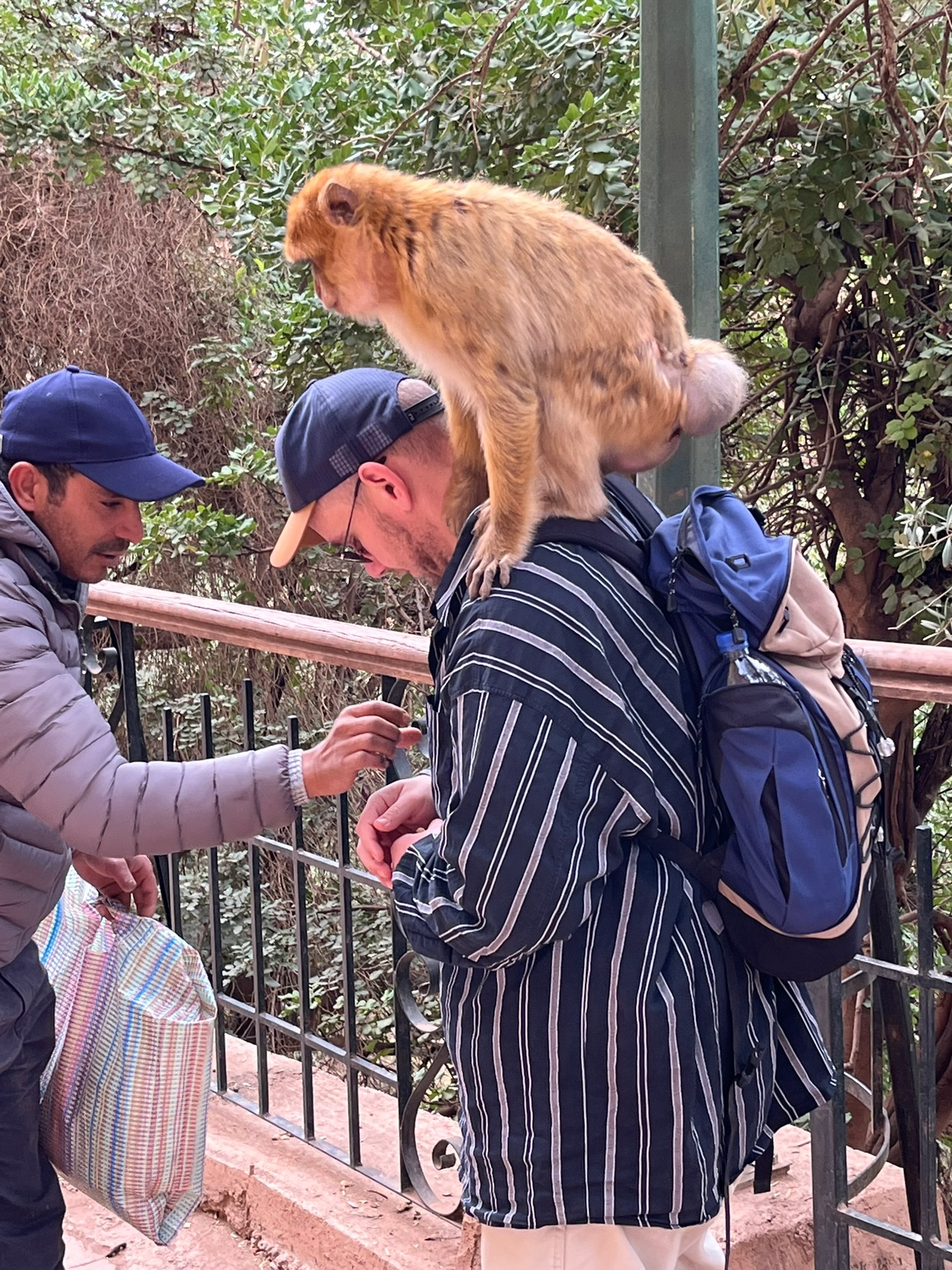 The Moroccan guy with the monkeys had a carrier bag full of peanuts. He was trying to force these into peoples hands or dropping them into peoples shirt pockets, encouraging the monkeys to climb up onto them. Several of our group were quite happy to have the monkeys climbing over them, trying to balance them on their shoulders and heads whilst trying to grab a selfie.