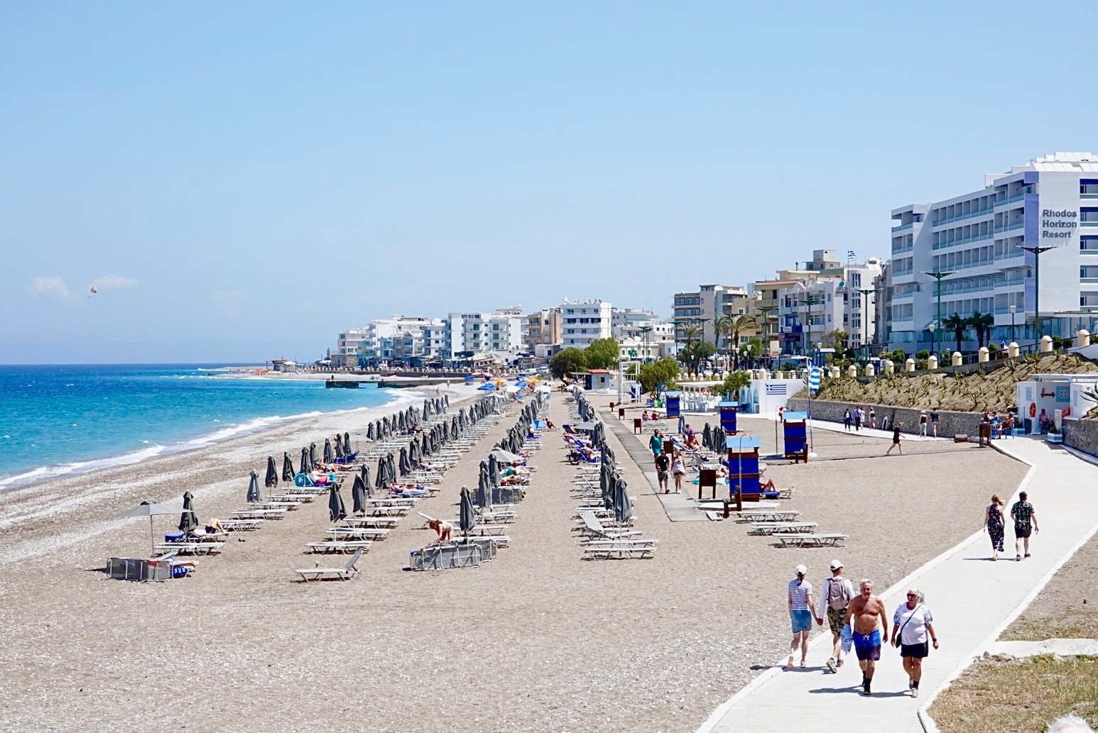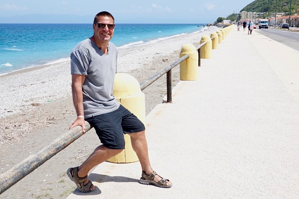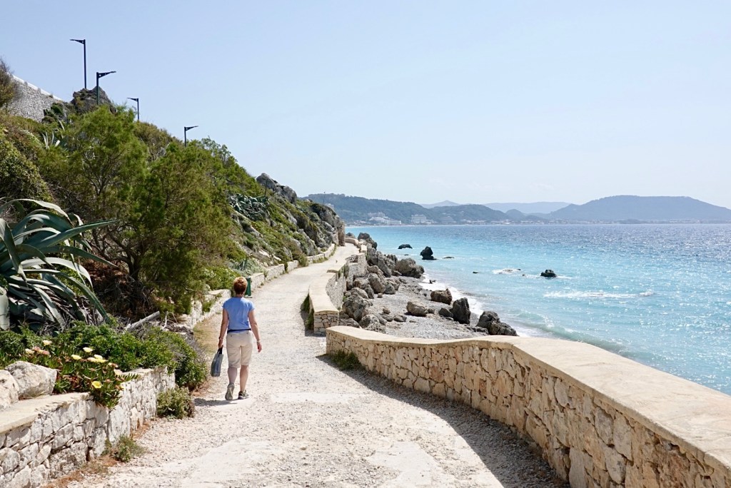We both like the Ialyssos area and we’re both quite happy taking the walk into the city. It’s flat all the way, although there’s a quicker route in to the centre of town over a hill. Most of the way it follows a road and walkway running along the seafront.
