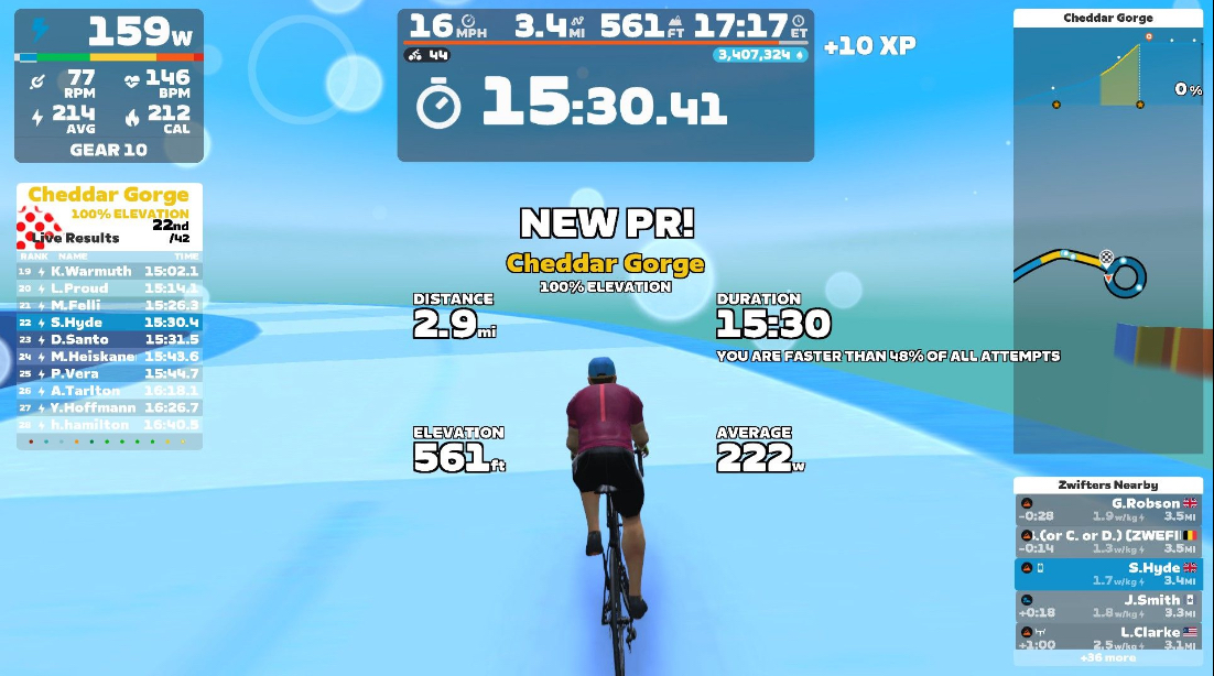 As a spooky coincidence I logged in to Zwift today, for a bike ride, and one of the guest hill portal climbs was Cheddar Gorge. I didn’t know it was a planned portal ride for this week. I felt I had no option but to take it on so, as well as walking it yesterday, I’ve climbed it on my smart bike today.