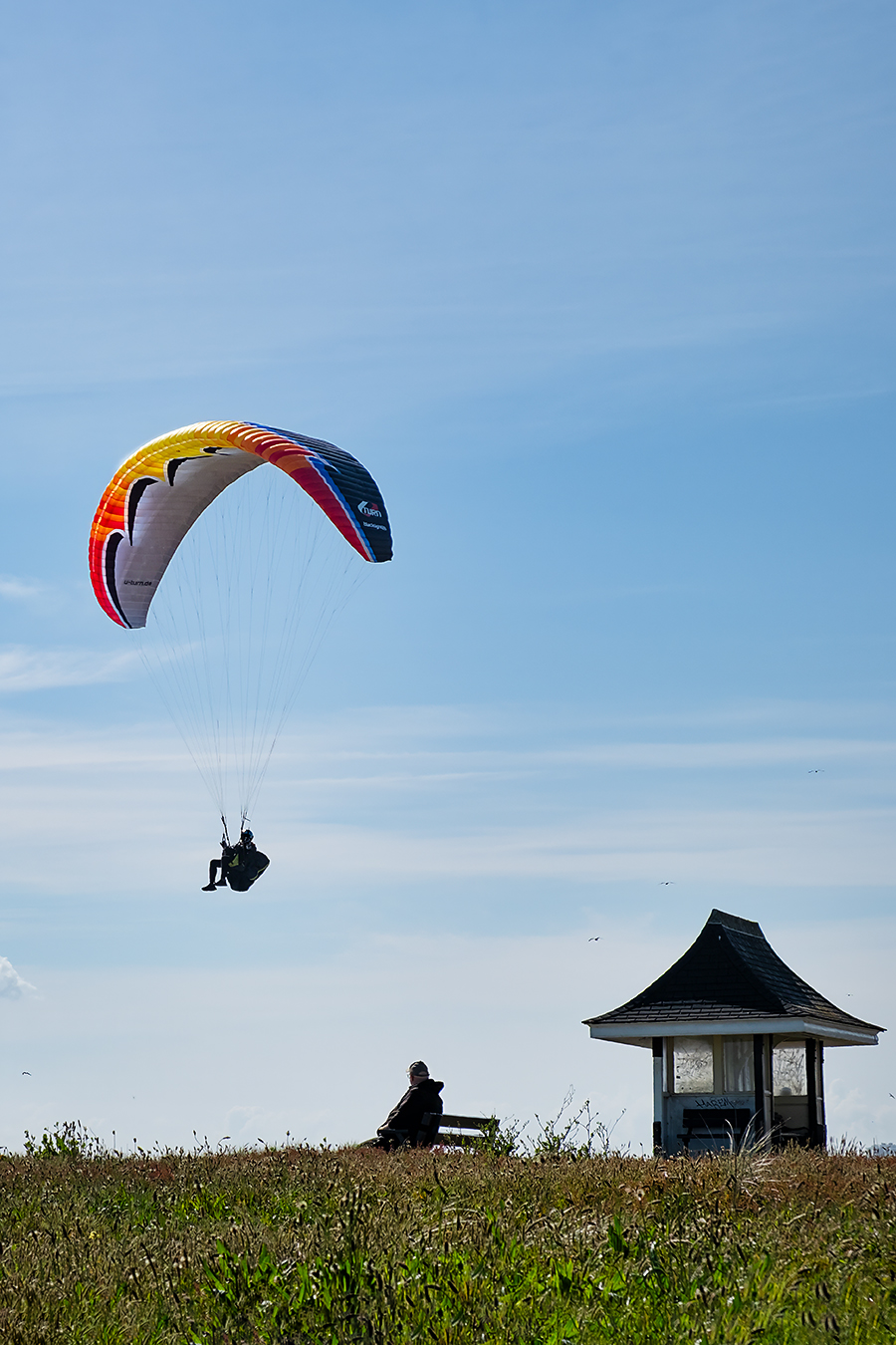David was home to meet us when we arrived at midday and whisked us straight off for a walk around the Boscombe sea front area to the east of Bournemouth. With it being a school holiday week here in the UK, combined with good weather, the beach was quite busy. We saw a few paragliders making the most of the good conditions and thermals to fly along the coastline.