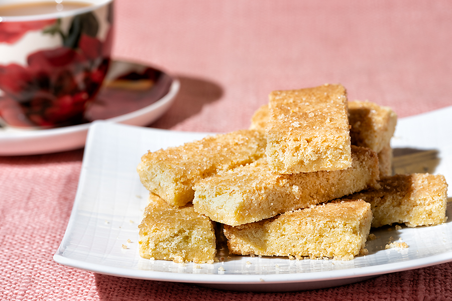 We found out, by accident, that keeping the baked shortbread in the fridge, after it had been baked, made it a lot easier to handle. The recipe yielded nine slices and they all disappeared the same day. Everyone really liked them.