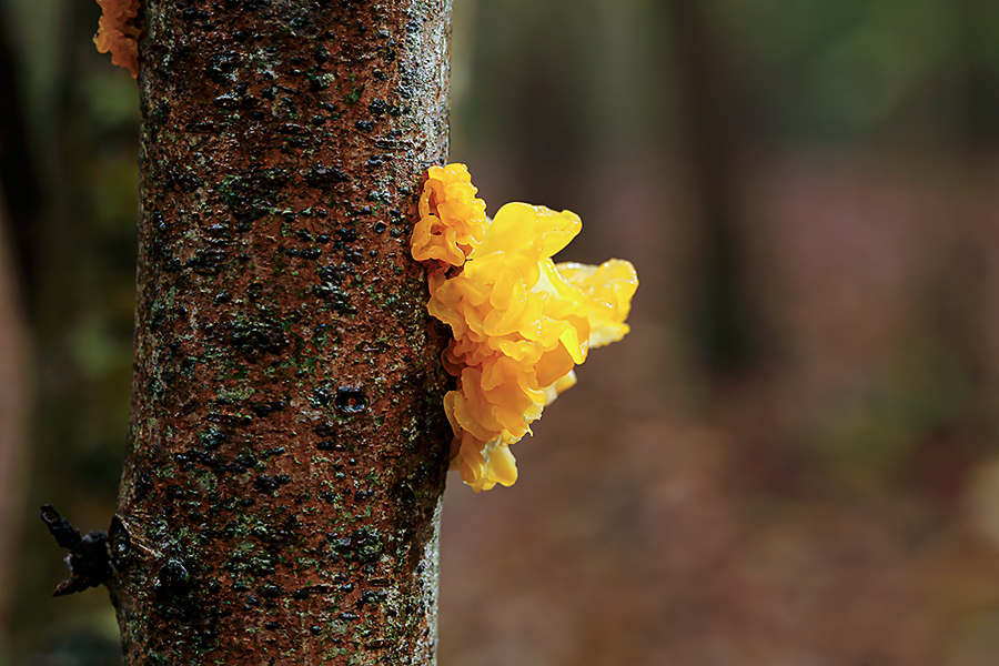 I rarely see this in our woodland but it’s my favourite for nicknames. It’s commonly known as Yellow Brain Fungus, Butter Fungus, Witches Butter or Golden Jelly Fungus.