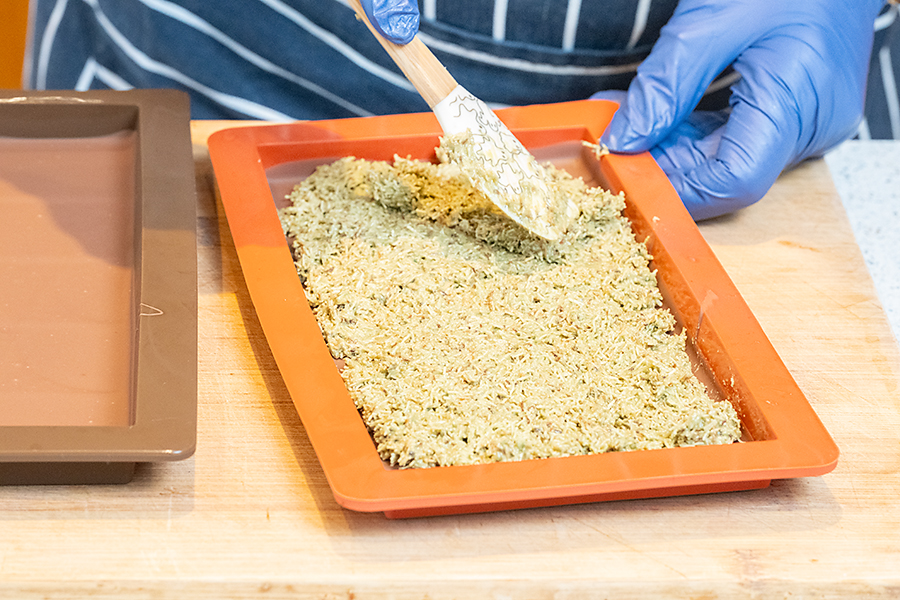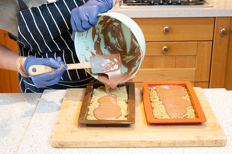 It’s made using milk chocolate to sandwich a filling of pistachio paste mixed with Kataifi Filo Pastry. Fine shredded strands that look like the Shredded Wheat breakfast cereal.