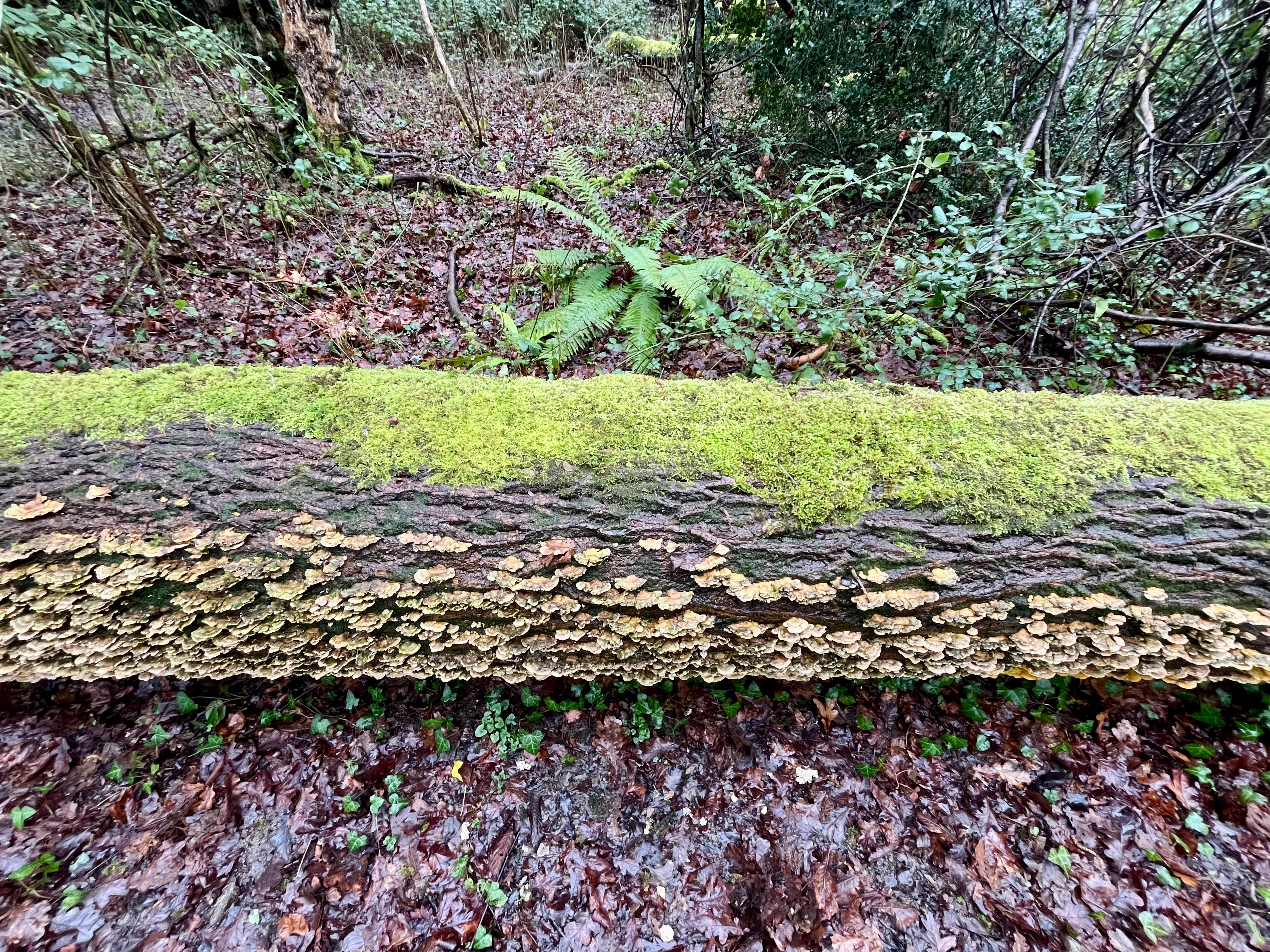 So, that trunk tree has fallen in the opposite direction of our prevailing south westerly winds here in the UK. Trees mostly do that. This has allowed the Turkey Tail Fungi to grow on the south eastern side of the trunk, which would be getting most of the light and warmth during the day. The lichen is growing on the north western side of the trunk, the cooler, darker side. I also I now know that this has created a Juxtaposition between both sides of the fallen tree trunk.