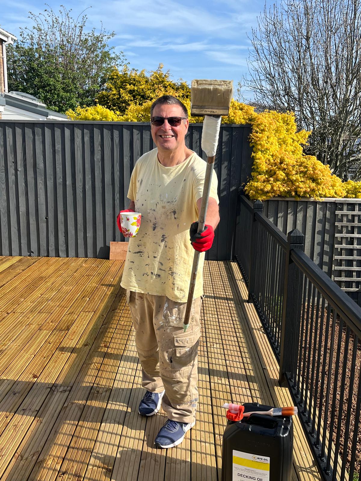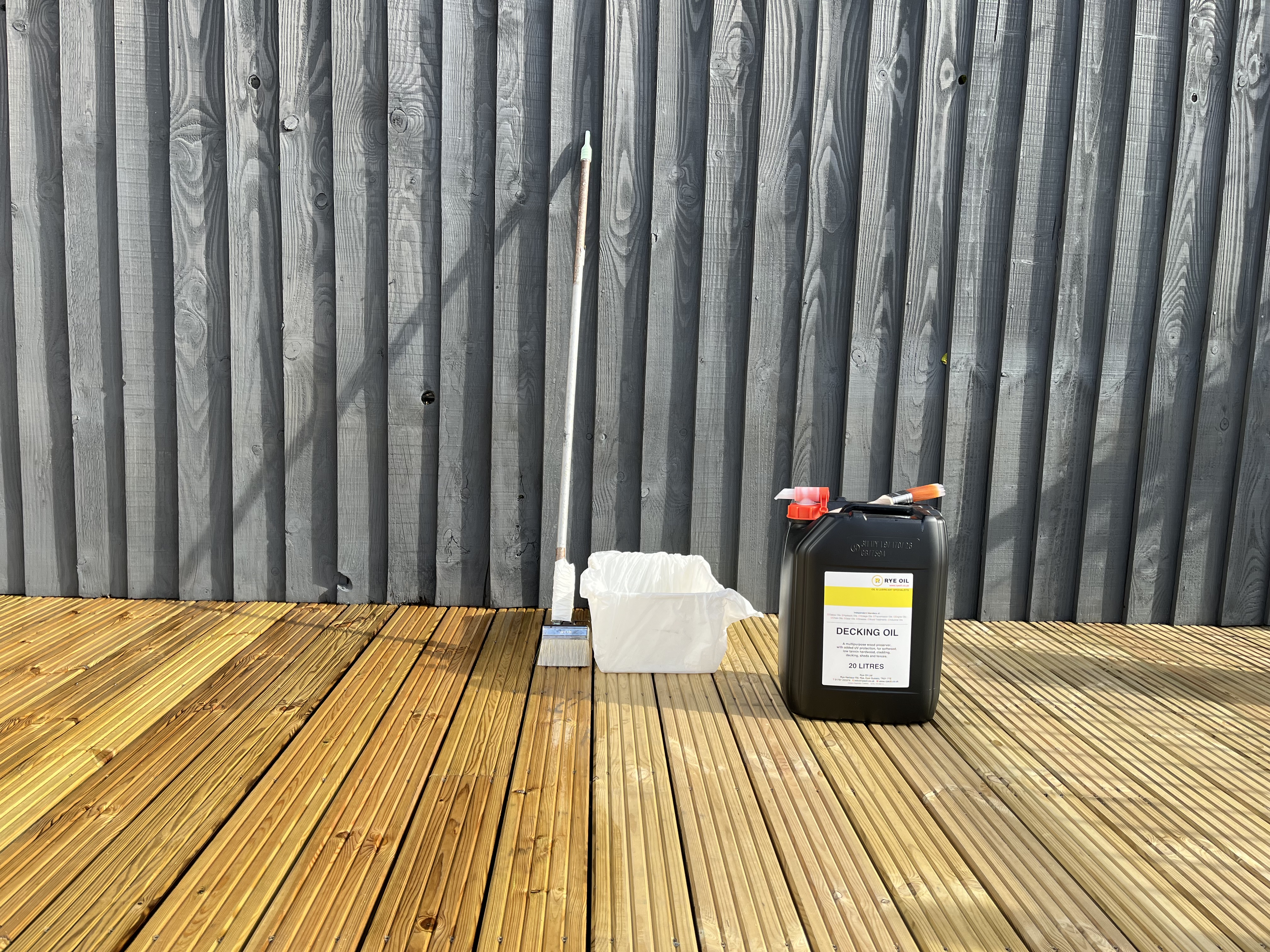 With the deck planks secured the final job was to treat it with decking oil. I did that this week as we’ve had fine weather here in the UK. I used a product called Rye Oil which was a reasonable £55 for a massive tub. I’d priced up using Ronseal Decking Protector and it would have cost me £250! The oil went down really well and three coats seemed to reach the wood saturation point.