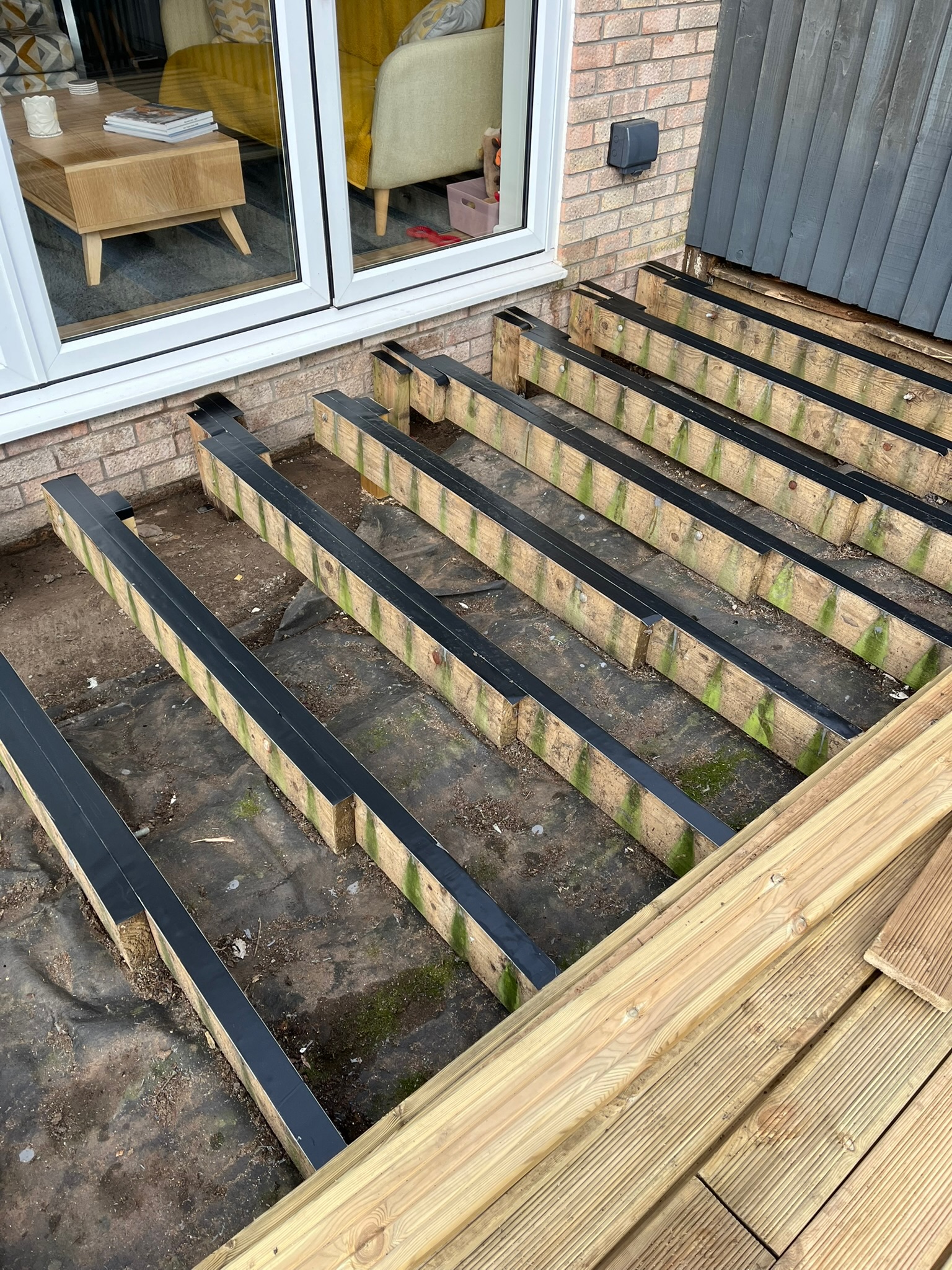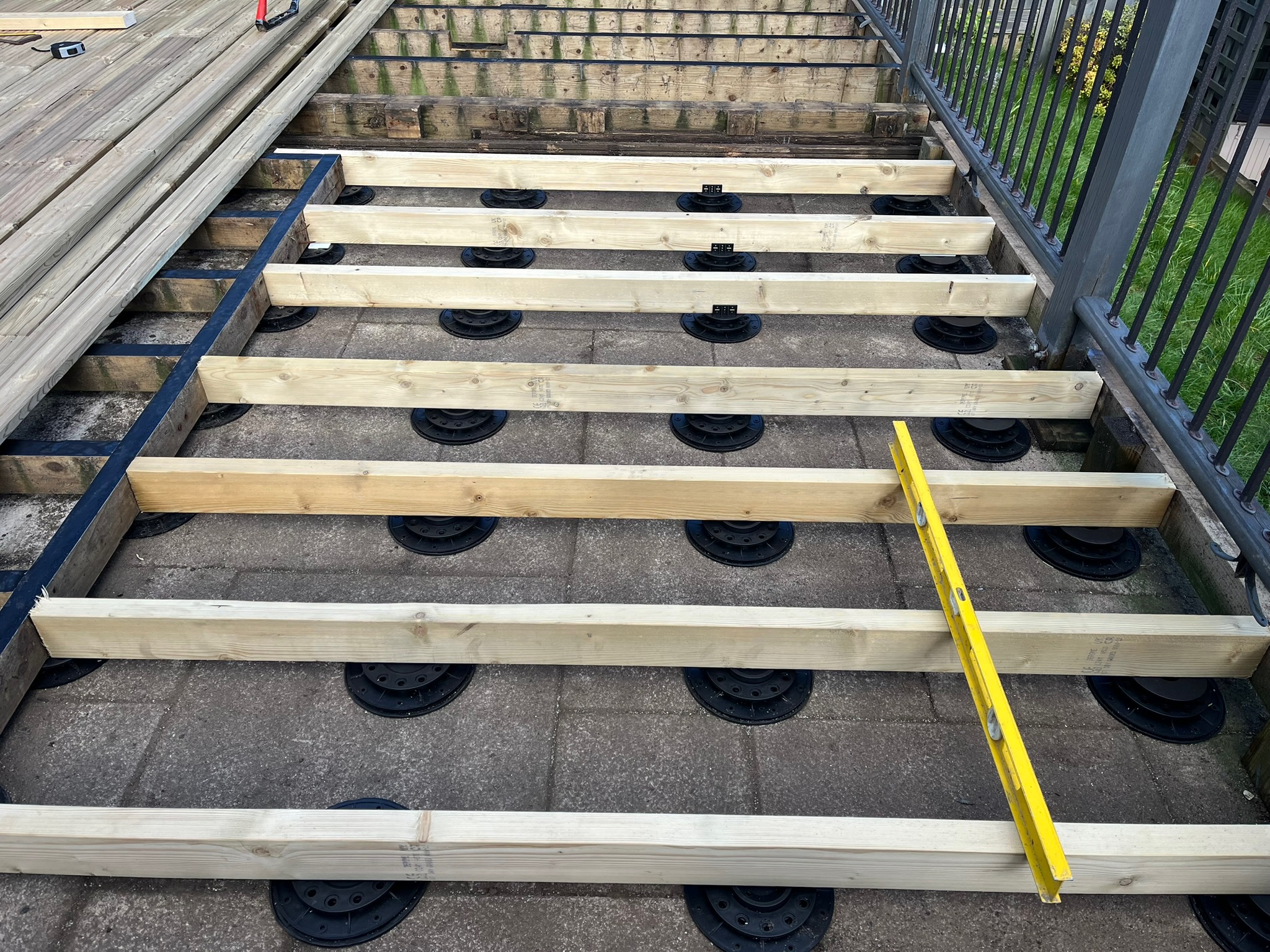 I applied joist tape to all the subframe timber and used plastic decking pads to support the frame that sits on top of the old patio. I bought them off a builder on Facebook Marketplace. I had to buy a job lot of 114 but he let me have them for £100. I only used 35 of them but that was still a big saving over what I would have paid for new, equivalent quality pads if I bought them new. I’ll try and sell on what I have left.