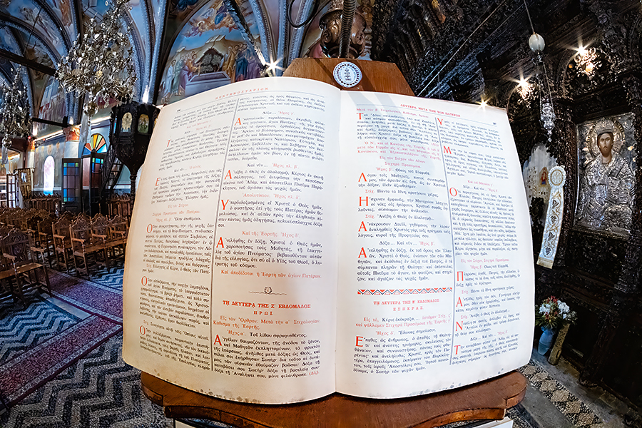 We’re on holiday in Rhodes, Greece this week so I don’t have access to my images, except for a few stored on my iPad. The best I could do, at short notice, was to pop in to a local Greek Orthodox Church, near our hotel, this morning and grab this. It certainly wouldn’t make for light reading but it is a book! Hopefully I can do better next week.